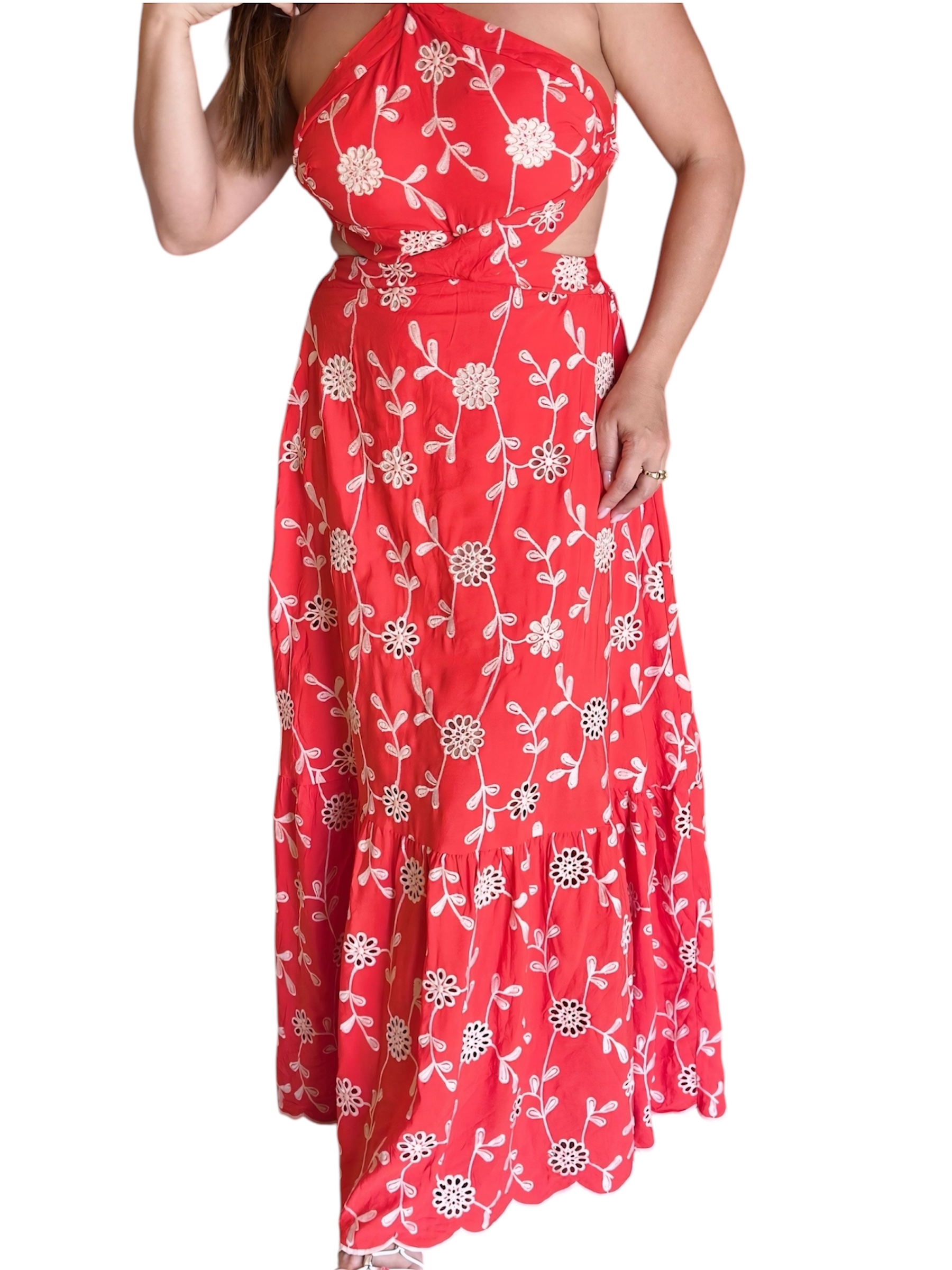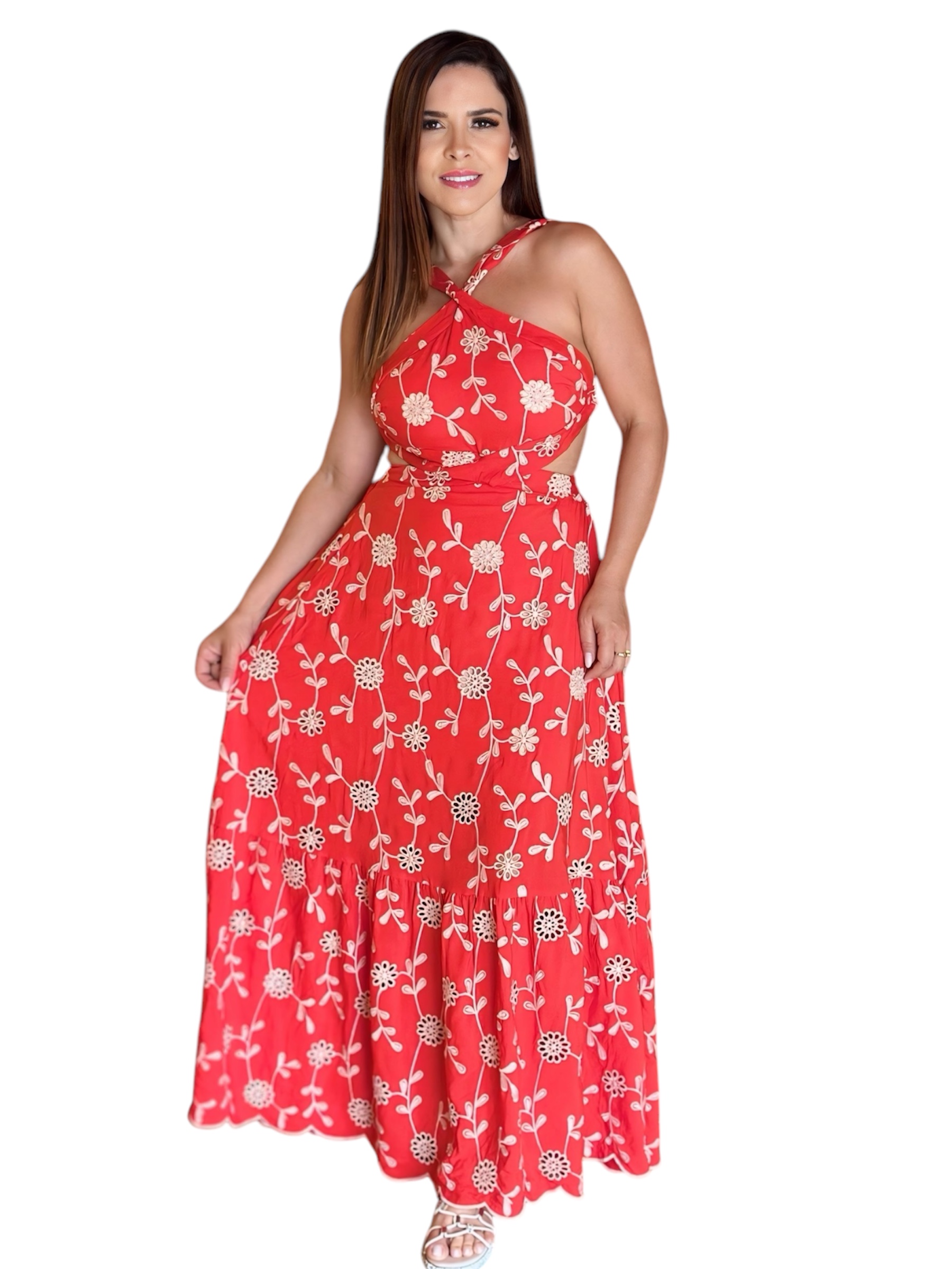 “Vestido longo confeccionado em viscose leve e fluida, ideal para um visual elegante e confortável. Apresenta detalhes bordados em lesie , adicionando um toque delicado e sofisticado à peça. O design frente única valoriza os ombros, enquanto a amarração nas costas e no pescoço permite um ajuste perfeito , o modelo possui bojo.Perfeito para eventos especiais ou ocasiões que pedem um look mais refinado e feminino.”