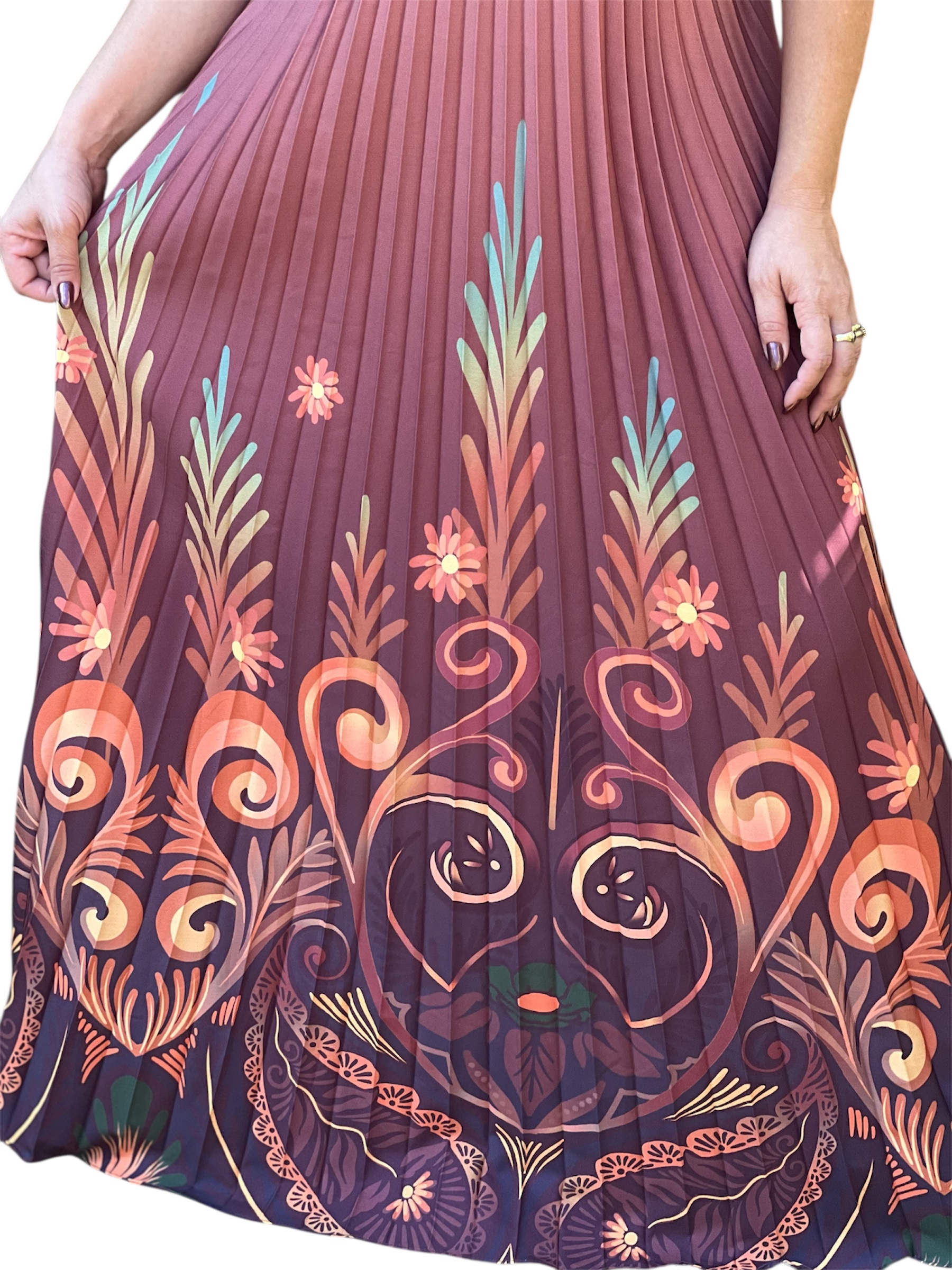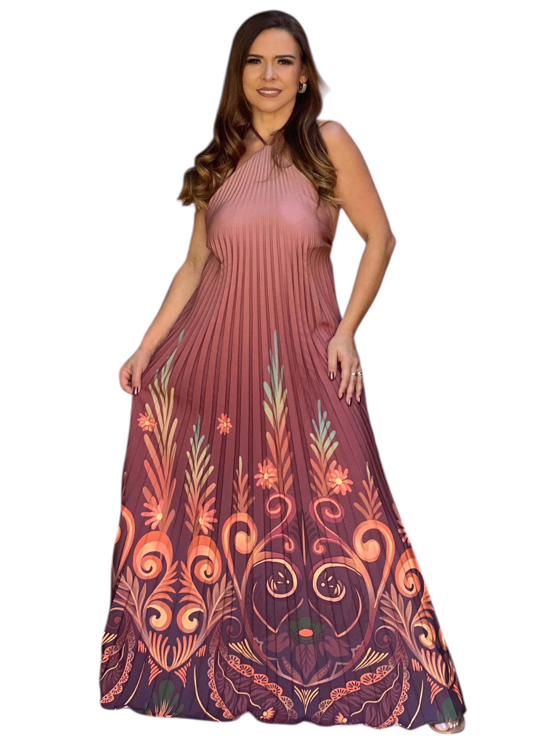 Elegante e cheio de charme, este vestido longo é a escolha perfeita para ocasiões especiais. Com modelagem evasê e tecido plissado que proporciona leveza e movimento, ele traz um degradê em tons de marrom ao nude conferindo sofisticação ao look. A estampa floral com arabescos na barra adiciona um toque artístico , modelo de costas nuas com amarração e delicados tassels garantem um visual feminino e marcante. Ideal para eventos ao ar livre, festas, casamentos ou jantares elegantes.